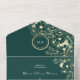 Elegant emerald green and gold all-in-one wedding invitation with floral design and monogram. This sophisticated invitation doubles as an envelope, featuring a built-in QR code for RSVP and a link to your wedding website. Perfect for modern couples who love timeless luxury with a touch of glamour. The rich emerald background and shimmering gold floral accents make it ideal for fall or winter weddings.