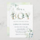 It's a boy baby shower invitation features painted watercolor eucalyptus, green leaves with botanical gold letters and a QR code on the back. For more advanced customisation of this design, please click the BLUE DESIGN TOOL BUTTON to change the font, size, colour, etc.