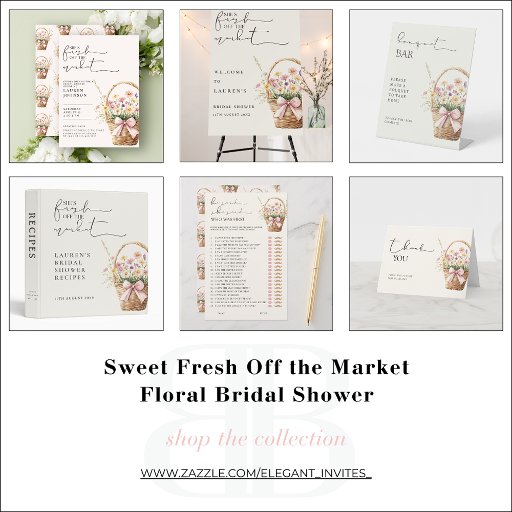 Celebrate her upcoming “I do” with this charming She’s Fresh Off the Market bridal shower invitation, featuring a soft watercolor floral basket tied with a blush pink bow for a sweet, garden-inspired look. Elegant script typography paired with a clean, airy layout creates a timeless design that’s perfect for spring and summer bridal showers.