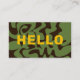 Hello in a bold font in gold yellow, on an asymmetric abstract design in brown and army green, this version has a qr code on the back.