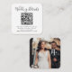 Simple, stylish wedding website photo enclosure card in a modern minimalist design style with an elegant natural script typography in classic white on a Green background, with an informal handwriting style font. The text can easily be personalised with your title, wedding website, scannable QR code, message and photo for a unique one of a kind wedding design to keep your friends and family up to date about your upcoming special day. The image shown is for illustration purposes only to be replaced with your own photo.
