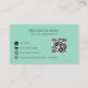 This unique business card is perfect for the owner who wants a fun pop of purple and mint colour. It features a modern abstract vibe and has a QR code on the back you can personalise with your specific website to help your clients book appointments with you effectively as well as find any information needed related to your business. Haver fun with this and set your self apart!