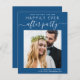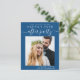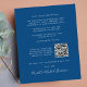 Modern budget-friendly classic blue elopement / private wedding announcement and reception save the date with your photo and "Save The Date For Our Happily Ever After Party" in simple white typography and a stylish white script with swashes. Under your photo, add your names, reception date and location; on the back, personalise your wedding announcement, input your wedding website address to create a QR code for your guests to scan for more information and add your names in a signature-like script.