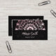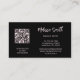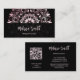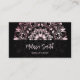 The top portion of the front side features a pink shiny metallic intricate floral mandala on a black background. The bottom portion features a black text field with an elegant script. At the backside is a scannable qr code for your website. Perfect for salon, hair-and makeup, beauty, yoga teacher, boutique or any female entrepreneur.