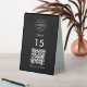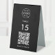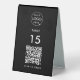 A simple custom black QR code resturaunt or cafe table tent table number double sided business sign template in a modern minimalist style which can be easily updated with your company logo, QR code and custom text.