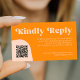 Abstract retro vintage groovy 70s style boho unique budget wedding scanning QR code wedding website response enclosure card with "kindly reply" bold typography in a vibrant trendy modern light pink and orange chic summer color palette. +++++++ Please note that all the colors are changeable. +++++++++ Bigger sizes available. ++++++++++++ Matching invitation and stationery are available in the collection.