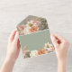 Elegant sage green all-in-one wedding invitation featuring watercolor florals in peach, ivory, and blush with pampas accents. Includes a scannable QR code and website for easy RSVP tracking. Perfect for eco-conscious couples who want a modern, paper-saving design without extra envelopes. Customise with your wedding details for a chic, convenient, and stylish celebration.