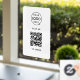 A simple custom white business vinyl window cling decal sign template in a modern minimalist style which can be easily updated with your company logo, QR code and custom text.