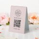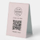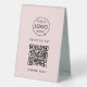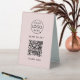 A simple custom blush pink business double sided table tent template in a modern minimalist style which can be easily updated with your company logo, QR code and custom text.