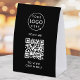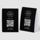 A simple custom black double-sided paper table tent sign template in a modern minimalist style which can be easily updated with your company logo, QR code and custom text. This template is designed for cafes, restaurants, bars and hospitality event catering businesses that want a modern and professional display without visual clutter. Easy to adapt for retail counters, cash wrap areas, studios, salons, food service setups, events or trade shows. The layout keeps everything centered and easy to read so customers can find your details at a glance. The editable fields allow you to update your business info quickly and adjust the text to suit your purpose. A simple and polished choice for everyday business use.