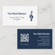 Classic music lessons business card with a navy blue treble clef symbol. With customisable lettering, you add your own information. You also add your website to allow for connection with a QR code. Great for promoting your music lessons or performing business.