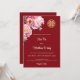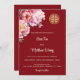 This elegant Chinese wedding invitation features watercolor peonies and a gold double happiness symbol on a dark red background. Bride and groom names in an elegant handwritten script. Chinese wedding invitation or tea ceremony invitation. At the backside are the details and a scannable qr code for your wedding website.