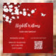 Pretty white and black cherry blossoms on a shimmering red background. Your name or company in an elegant handwritten font. Your title, opening times and a scannable qr code.