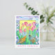 A nice bright postcard for spring featuring a quail couple exploring the pink tulip garden with lavender butterflies and bright yellow sunshine drawn in ink and painted with watercolor.