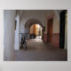 A narrow, cobblestone alleyway lined with arched walkways and colourful buildings, with a bicycle parked near the entrance. White and Brown.