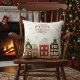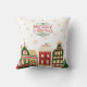 A festive throw pillow of a quaint Victorian village, its charming houses dressed in festive holiday decor, each window emitting a warm, inviting glow with gold snowflakes falling in the background and the text - Merry Christmas - at the top.