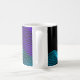 Quantum Disco Dimension Purple Blue Black Gold Mug features aqua blue and black abstract dimensional lines in space with a shiny gold planet-like sphere in the upper left corner floating above the geometric quantum waves of purple and green forming an abstract design against a deep black background. This mug inspires deep thoughts with a touch of fun in a style that's contemporary, boho, spiritual, and eclectic. See more beautiful coordinating and matching customisable designs with a spiritual theme in our store at zazzle.com/NextDimension.