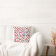 A repeat circular quarter leaf cut out style patterned pillow in bold winter warmer colours reds, golds, teal blue, grey and white by Sarah Trett. Would look great in a bedroom or lounge room.