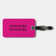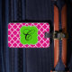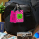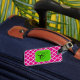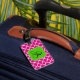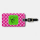 This quatrefoil print tag will be a great way to identify your bag. The colours are pink and white with a bright green frame for your initial.