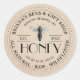 Textured background in a neutral kraft colour with central design featuring a vintage queen bee illustration. Personalise with your apiary name, address and honey description (raw, hand bottled, single source etc.).