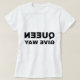 Image mirror text Queen Give Way on the front and a text Queen Don't Tailgate on the back of the funny female, woman's t-shirt piece of apparel. Transport warning signs joke and humour. For fun and laugh. Customisable. You can change or delete the text on the back and you can change the image on the front. Have fun!