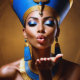 Queen Nefertiti (c. 1370 - c. 1330 BCE). Queen Nefertiti, the Great Royal Wife of Pharaoh Akhenaten, is one of the most famous figures of ancient Egypt. Known for her beauty and powerful position, she co-ruled during one of the wealthiest periods in Egyptian history and played a role in the country's religious revolution by promoting the worship of Aten, the sun disc. An imagined stylised portrait of Queen Nefertiti with an elongated neck and high cheekbones and full lips, displaying regal elegance and beauty.