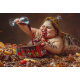 “Queen of Gluttonous Decay” Colourful Portrait. A darkly humourous and grotesque portrait symbolising the consequences of unchecked indulgence. This surreal artwork depicts a woman grotesquely transformed into a witchetty grub amidst a mountain of sweets and wine, embodying the excesses of consumer culture and personal neglect.