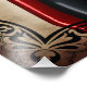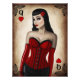 Pinup style queen of hearts design with grunge effects. Features an illustration of a beautiful young woman, with long black hair, wearing a red corset.