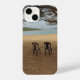 This image shows a phone case featuring a peaceful lakeside scene. Two empty plastic chairs sit on sandy ground facing a calm body of water. In the background, gentle hills stretch along the horizon under a soft, cloudy sky. Tree branches frame the top of the scene, adding a natural and tranquil atmosphere. The setting evokes a sense of solitude, reflection, and quiet companionship.