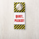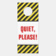 This design features the message "QUIET, PLEASE!" in bold red text, along with yellow and black coloured caution stripes.