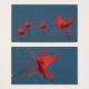 A family of red origami cranes floats across the still water of a pool while the raindrops splash around them.