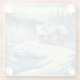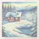 On this glass coaster is a cabin home in the woods by a creek at winter time and there is a little frozen creek a very cozy scene.
