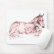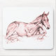 A black and white ballpoint pen illustration/drawing of a young horse laying on the ground just waking up from its nap (with salmon coloured filter). Artwork by ballpoint pen artist Robin Cox.