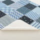 Quilt design. Seamless patchwork pattern from stitched squares with different geometric ornaments. Textile print in blue colours.