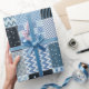 Quilt design. Seamless patchwork pattern from stitched squares with different geometric ornaments. Textile print in blue colours.