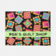 Welcome customers to your quilt store or business with this colourful door mat personalised with your business name. You can easily customise the name or other words for your door entrance. This door mat is great for promoting your quilt patchwork business and show quilting love and is also great for a quild or quilt class. The customisable business name is on a light green strip and can easily be customised to another word or name. This original quilt art combines favourite quilt blocks such as log cabin, stars and pinwheels plus unique blocks to form a quilt design with vibrant and dynamic colours that pop on a black background. The block colours are green, yellow, pink, orange, red, and turquoise blue. Small yellow flowers are in the background between the blocks. Fully customisable Quilt art is from fabric and quilt designer Phyllis Dobbs and is easy to make it your own.