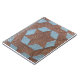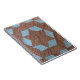 Quilt block in brown and blue "castle" pattern. The central "castle" is a brown star shape, surrounded by the "6 sided wall" with the "watch towers" extending out from the middle of the walls.