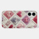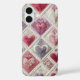 Intricate heart designs in various shades of pink, red, and purple are arranged in a diagonal quilt pattern