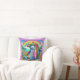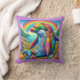 The pillow features a captivating patchwork dolphin, composed of a kaleidoscope of vibrant colours and intricate quilt-like patterns. This delightful sea creature appears to leap out of the lush, floral landscape that blooms in an abundance of colours, resembling a terrestrial paradise. Above, a magnificent rainbow, rich in every hue, spans the horizon, framing the dolphin in a spectrum of joy. The ocean in the background mirrors the clear blue sky, adding a tranquil contrast to the exuberant foreground. With its bright, inviting colours and cheerful demeanour, this digital illustration radiates a sense of oceanic joy and imaginative wonder. It’s a splendid addition to any space, ideal for invoking a sense of serenity and playfulness, perfect for a child's bedroom or a whimsical living area.