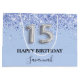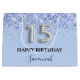 Elegant, classic, glamourous and girly for a Quinceañera, 15th birthday party. A trendy baby blue, light blue background. Decorated with faux glitter dust. Personalise and add a name. With the text: Happy Birthday. The name is written with a modern hand lettered style script. Number 15 is written with a balloon style font.