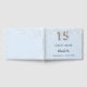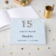 A stylish baby blue background with faux silver glitter, sparkles and number 15 written with a ballon style font. Add your name, date.