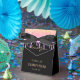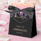 Elegant, classic, glamourous and girly for a Quinceañera, 15th birthday party favours. A black background. The text: Quinceañera and Thank You, written with a modern hand lettered style script. Decorated with faux glitter drips, paint dripping look in rainbow colours: purple, pink and rose gold. Personalise and add a name and a date. Golden coloured text.