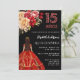 A modern, stylish and glamourous invitation for a Quinceañera, 15th birthday party. A black background, a girl wearing a red and gold dress and red, pink and golden roses, florals. The name is written with a modern hand lettered style script. Personalise and add your party details.