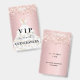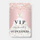 A modern, stylish and glamourous badge for a Quinceañera, 15th birthday party. A blush pink gradient background with rose gold faux glitter dust. With the text: VIP. Personalise and add name, age, address/date. The name is written with a modern hand lettered style script with swashes.