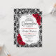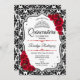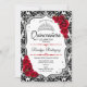 Features damask pattern, script font, red roses, tiara and confetti. Classy design with faux glitter silver. Perfect for an elegant glam celebration.