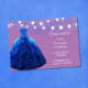 Surprise all your guests with this magical, denim blue and blush design for the sweet fifteen honoree. Blue diamond glitz princess gown with swirling glitter motifs on dress, under white string lights on lavender background.