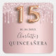 For a girly and glamourous Quinceañera, 15th birthday party. A dusty rose, pink faux metallic looking background with faux glitter drips, paint dripping look. Personalise and add a date, name, age/text. The name is written in dark grey with a modern hand lettered style script. Number 15 is written with a golden balloon style font.