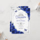 Royal blue, silver and white Quinceanera celebration invitation. Features script font, silver butterflies, royal blue roses and tiara. Perfect for an elegant princess style glam celebration. Personalize with your own details. Printed Zazzle invitations or instant download digital printable template.
