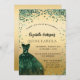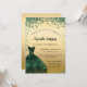 A modern, stylish and glamourous invitation for a Quinceañera, 15th birthday party. On the front: A faux gold looking background with green confetti, an emerald green dress. The name is written with a modern hand lettered style script. Personalise and add your party details.