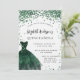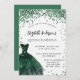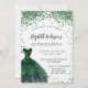 A modern, stylish and glamourous invitation for a Quinceañera, 15th birthday party. On the front: A white background with green sparkles, an emerald green dress. The name is written with a modern hand lettered style script. Personalise and add your party details.